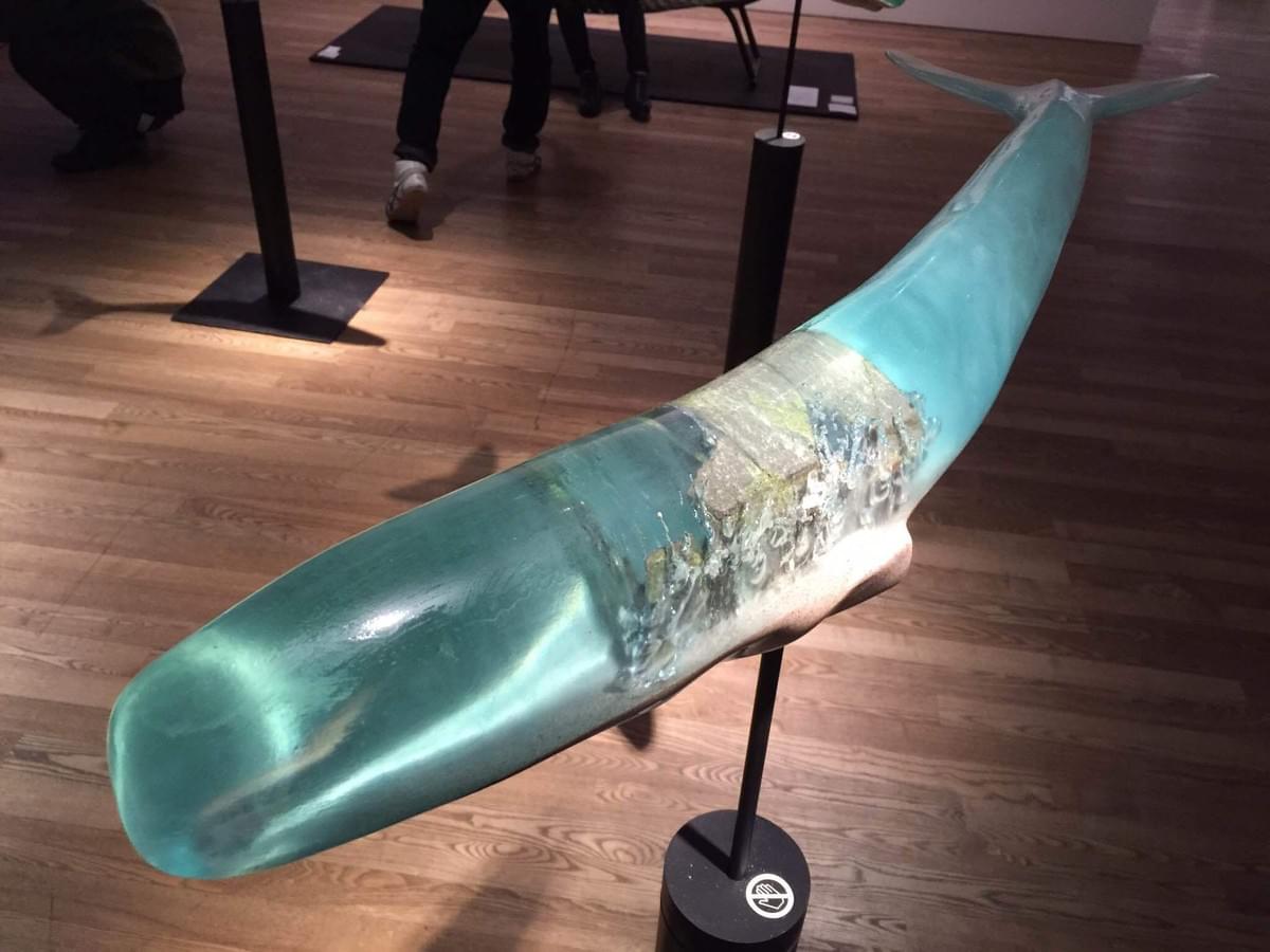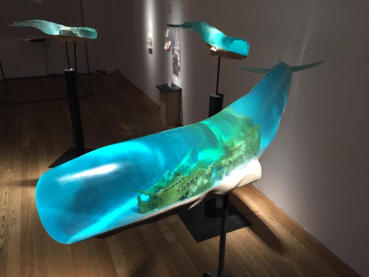 Inside each whale encapsulates various objects, such as submarine volcano, sailboat, and a sea of clouds.
